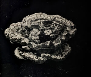 I watched this amazing fungus grow for several months before finally taking this image. (Note: the digital image here is a poor snapshot of the slide on a lightbox; we haven’t scanned this negative yet.) I used a Rollei 6006 to shoot this as a sequential macro, as I had it loaded with special 65mm Double-X film (made specially for the movie Oppenheimer, and given to me by the folks who worked on that film) for another project. This was partially a test of the Mercury Stereo Toolkit app for MF3D, to see if real world results would vindicate its calculations for macro 3D. I think it nailed it! This is an M-Chrome made from the negative. I discovered that Double-X BW film makes really spectacular M-Chromes. I shouldn’t have been surprised: it is a negative film designed specifically to make film prints! 80mm lens.