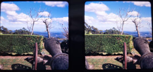 This was from atop Bartolomé island in the Galapagos. On this island, the one that most influenced Charles Darwin, no visitor is allowed to set food on the natural rocks and soil of the island, as part of its extraordinary ecological protection. The result is that when one sets foot on the island, one must walk from the dock to the boardwalk seen here. A trail then wends through the peaks of the island in a large loop. From this vantage I was able to capture the somewhat strange sight of the boardwalk, as well as a cactus-like plant that I had never seen before, but found alien and beautiful. Taken with my Mercury Stereo 12 on Kodak E100 film with Mamiya 80mm lenses.