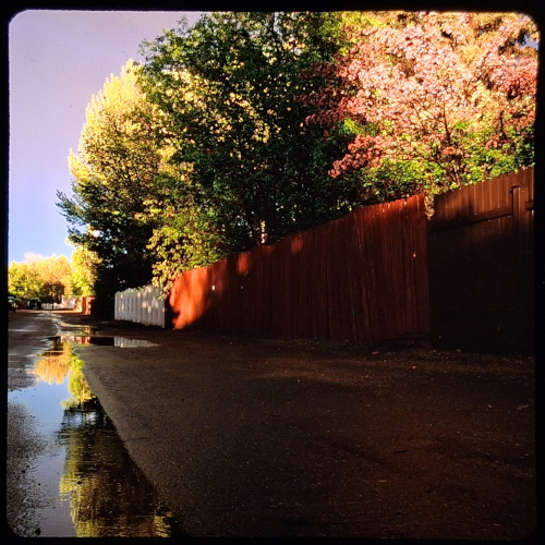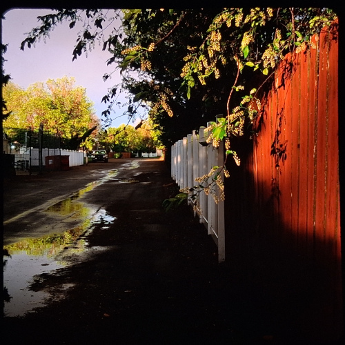 Sorry for the two similar views, but I’d like to get your feedback. After a spring storm, the clouds cleared right around sunset and there was some really wild light. I was totally overcome by the atmosphere that I found myself immersed in. There were lots of wonderful wet reflective surfaces and great textures highlighted by the low angle of the sun peeking out from the clouds. I knew I only had a few minutes before the sun set, but I didn’t know where to point my camera. I was just around my house in a suburban environment and the neighborhood is rather photographically uninspiring ). I knew I had to try to shoot something in 3D, so I grabbed my TL-120 and ventured down the alley. I’m curious if you’ve ever found yourself in a similar situation. How would you approach shooting this situation? Do you see any potential compositions in these two slides that I overlooked?