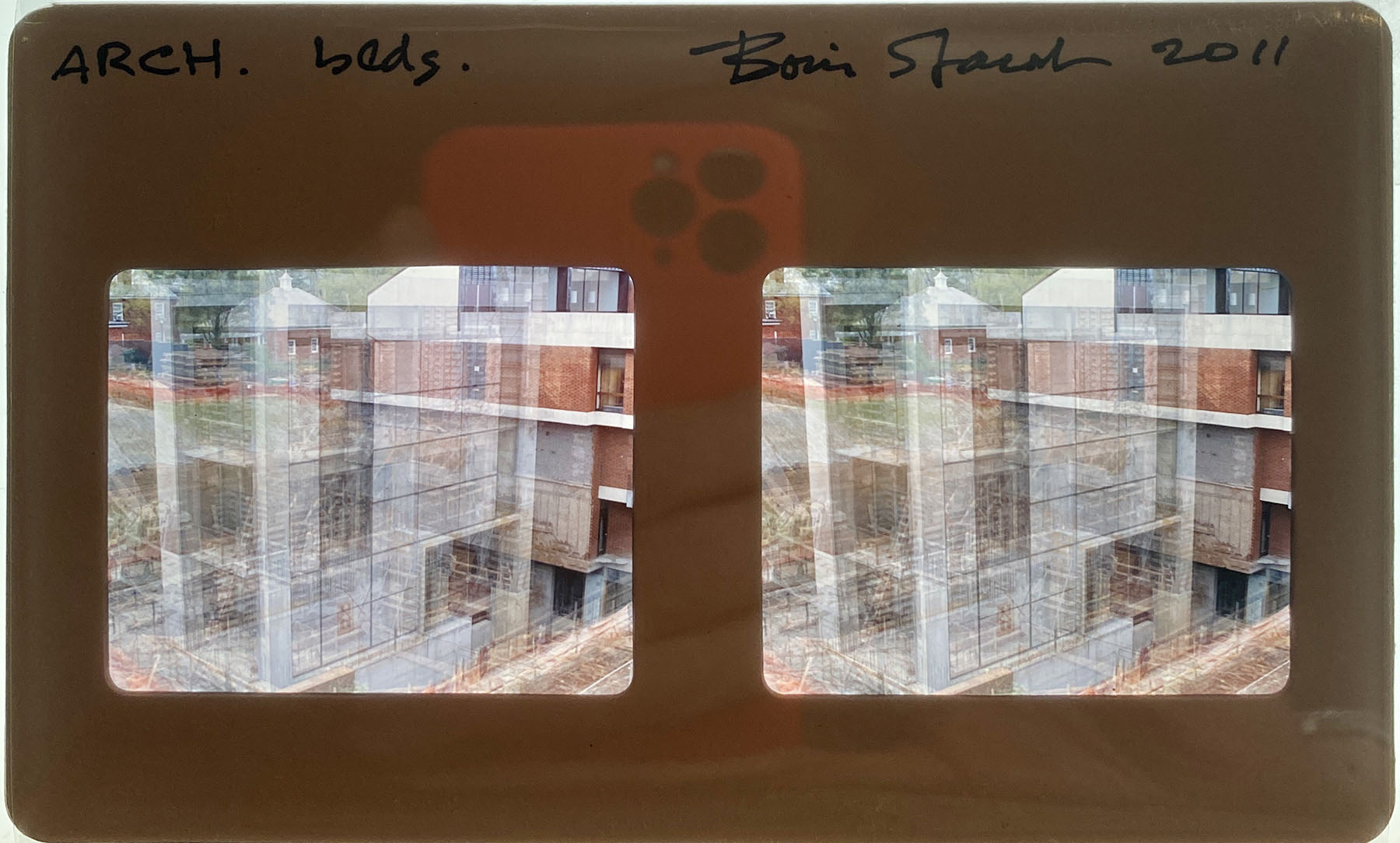 In the many views obtained of this and other buildings in those years, final composition was a matter of luck and some imagination. Depending on the site and building, I might have had a chance to look at some plans or an architect’s model, and from these inputs, I had to decide on where to place and how to point the cameras. Two more buildings came out quite well.
