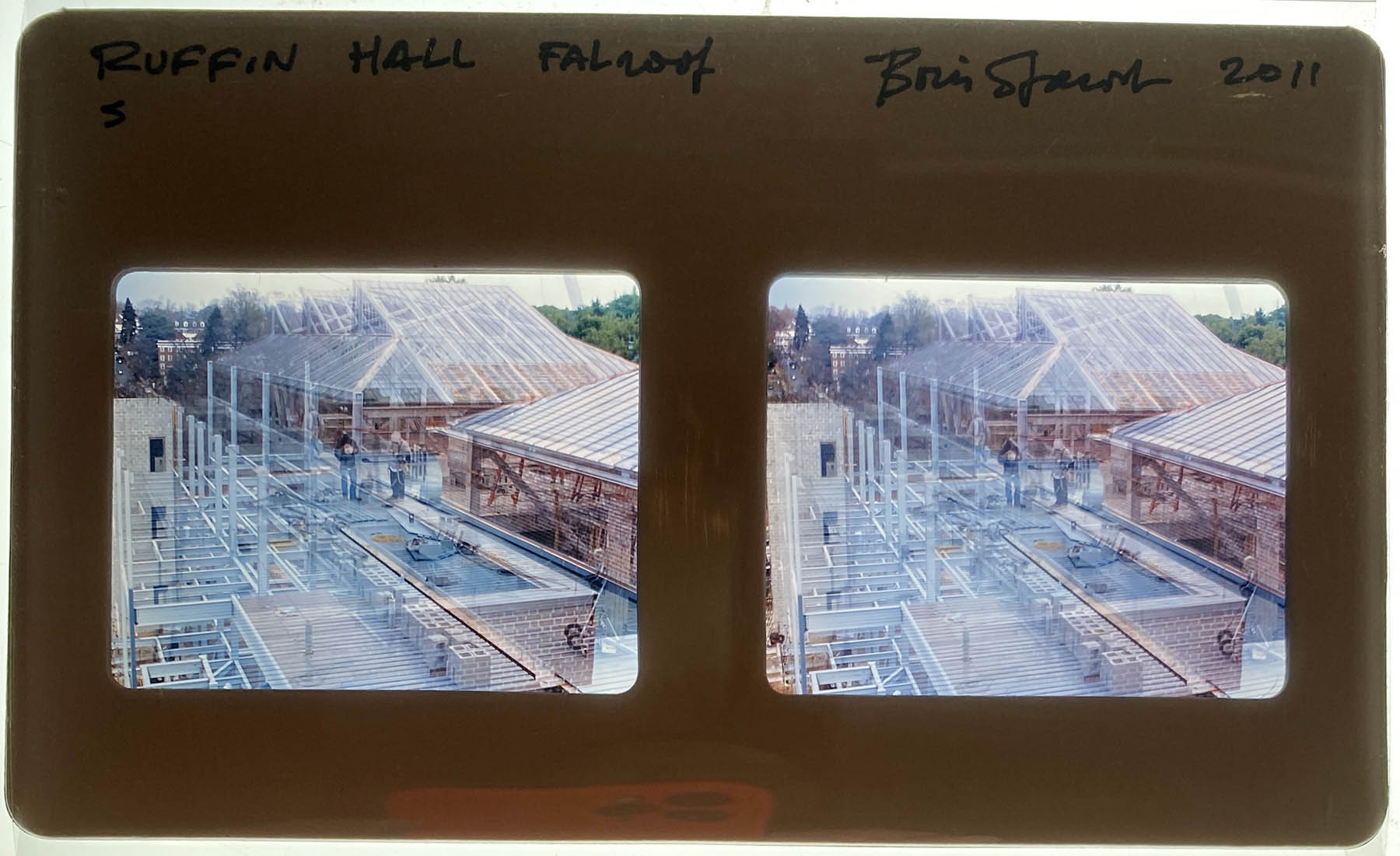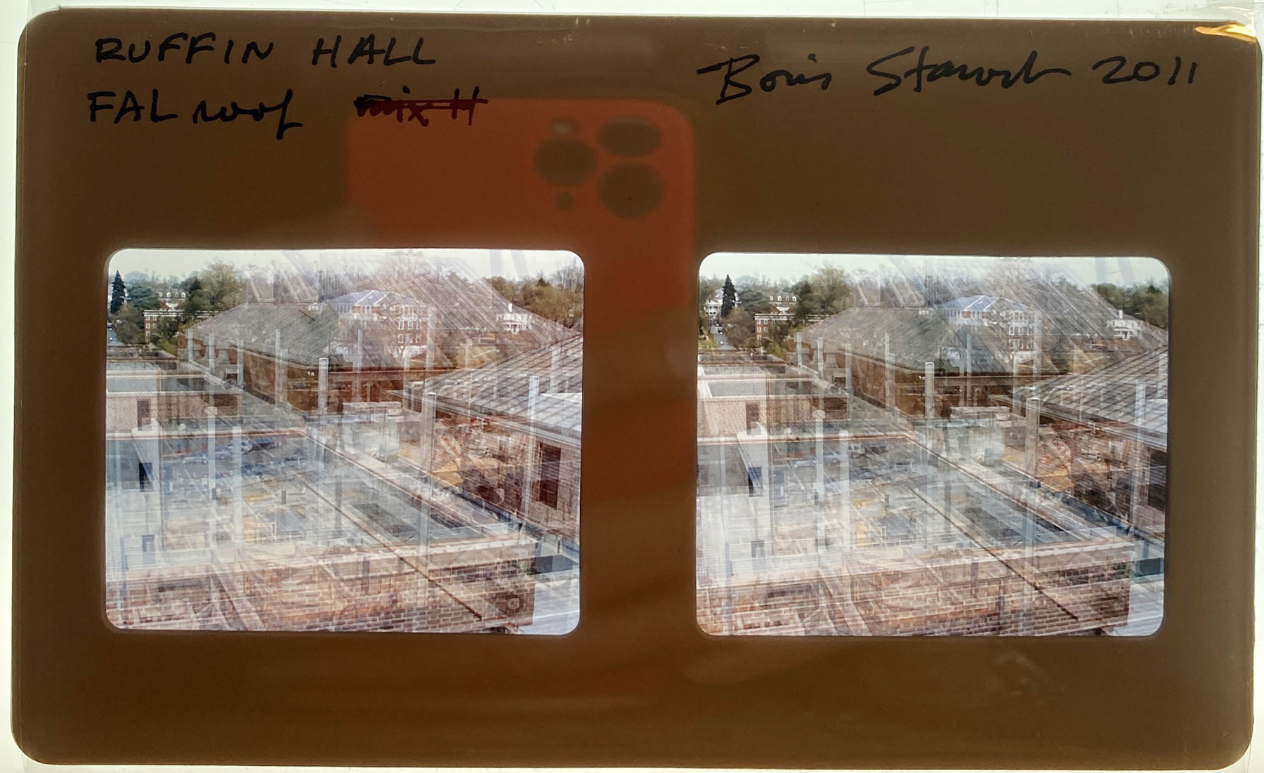 For example, in this second image of Ruffin Hall, I blended the images to show a progression of time, starting on the left side showing the earlier exposures, smoothly blending to the right side, where the building is shown finished. In-between, in the middle, is that delectable semi-transparent structural complexity that can be appreciated best only in 3D. By a pure lucky coincidence, some men in the middle of the image are conversing, but one pair of the men were photographed at a completely different time than the second pair of men. It looks almost like they are all conversing together in a time warp!