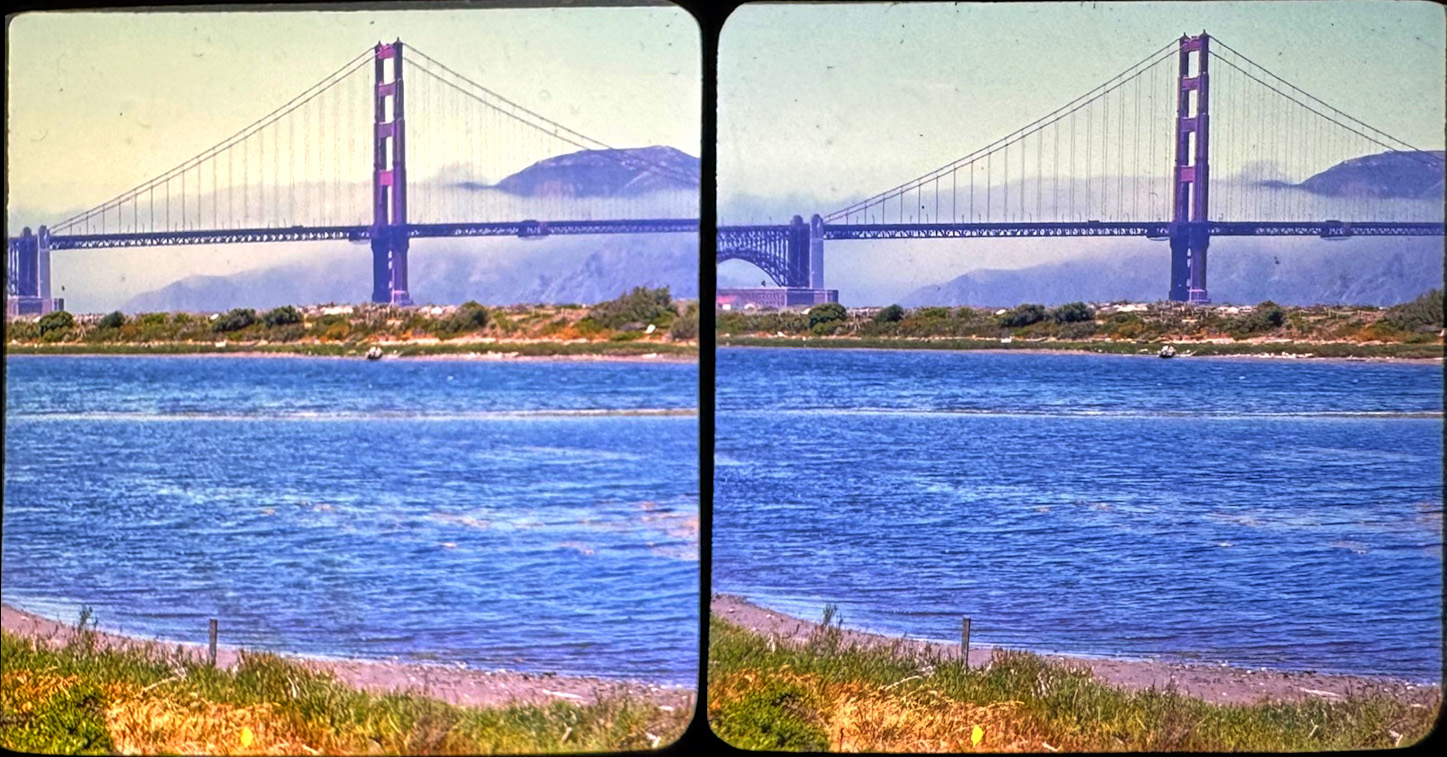 This was photographed with a Twin Mamiya C220 rig using 135mm lenses. I quite enjoy the “stretched” effect of slightly hyper telephoto stereo. I had the right camera aimed a bit too far to the right and hadn’t been able to mount this image until I happened upon a sample of Ian’s 127 format mount. This reduces the width enough for me to be able to get a usable window for this shot.